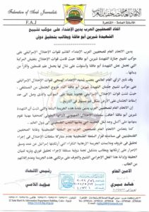 كما يتضامن الاتحاد العام للصحفيين العرب مع السلطة الفلسطينية ونقابة الصحفيين الفلسطينيين فى مساندته لقرار السلطة الفلسطينية بعدم مشاركة سلطات الإحتلال فى إجراء تحقيق فى ظروف وملابسات الجريمة الإرهابية النكراء التي أرتكبتها إسرائيل عن عمد وسبق الإصرار على إرتكابها ويطالب بتشكيل لجنة دولية مستقلة لإجراء تحقيق فوري ونزيه لتبيان الحقيقة وإدانة هذا الفعل الإجرامي الشنيع والتعرف على مرتكبي هذه الجريمة وعدم إفلاتهم من العقاب .