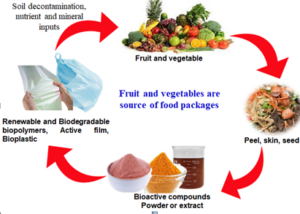 حيث يتم استخدام مخلفات الخضر والفاكهة من قشور وبذور…. الخ وتحويلها بعد تنظيفها وتجفيفها ومعالجتها بعدة طرق الى مواد خام لإنتاج بلاستيك قابل للتحلل في البيئة او البلاستيك الحيوي، كما يمكن إعادة منتج التغليف هذا إلى التربة وبالتالي يصبح بمثابة غذاء للنباتات مرة أخرى وهكذا يستمر إعادة استخدام المخلفات أكثر من مرة. |