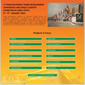 تطلق حكومة باكستان المؤتمر الرابع لتنمية التجارة الباكستانية الإفريقية ومعرض الدولة الموحدة المقرر عقدهما في الفترة من 9 إلى 11 يناير 2024. وسيعقد هذا الحدث الضخم والمرتقب في مركز مصر الدولي للمعارض والمؤتمرات.