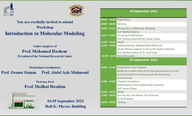 في الفترة من 4 إلى 5 سبتمبر2022 يقوم مجال الاطياف والنمذجة الجزيئية بالمركز القومي للبحوث برئاسة الاستاذ الدكتور مدحت ابراهيم بتنظيم ورشة عمل سوف تعقد بالمركز القومي للبحوث تحت عنوان “اساسيات وتطبيقات النمذجة الجزيئية والاطياف”.