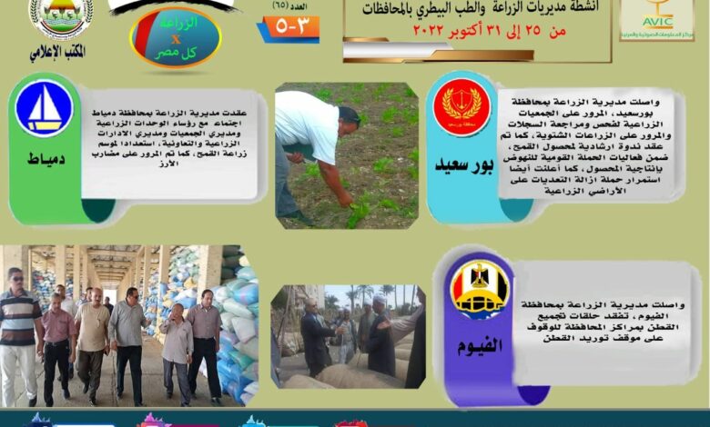 تعرف على أنشطة وجهود مديريات الزراعة والطب البيطري خلال الفترة من ٢٥ وحتى ٣١ اكتوبر الجاري