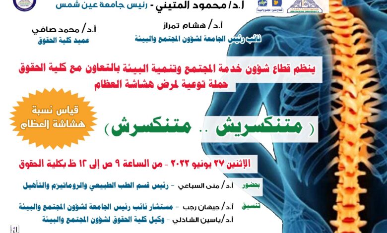 ينظم قطاع شئون خدمة المجتمع وتنمية البيئة بالتعاون مع كلية الحقوق حملة للتوعية بمرض هشاشة العظام تحت عنوان ” متنكسريش & متنكسرش ” وذلك يوم الاثنين الموافق ٢٧ يونيو الساعه ٩ صباحاً وتستمر حتى ١٢ ظهراً بكلية الحقوق يتم خلال الحملة قياس نسبة هشاشة العظام وذلك بحضور الأستاذة الدكتورة منى السباعي رئيس قسم الطب الطبيعى والتأهيل والروماتيزم بكلية الطب بالجامعة ، وبتنسيق الأستاذة الدكتورة جيهان رجب مستشار نائب رئيس الجامعة لشؤون خدمة المجتمع وتنمية البيئة والأستاذ الدكتور ياسين الشاذلي وكيل كلية الحقوق لشؤون خدمة المجتمع وتنمية البيئة وإشراف الأستاذ سهيل حمزة أمين الجامعة المساعد لشئون خدمة المجتمع وتنمية البيئة.