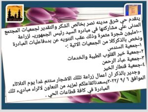 تقدم حى شرق مدينة نصربتوجيه الشكر لكافة الجمعيات ومؤسسات المجتمع المدنى المشاركة فى المبادرة المتميزة لزراعة 100 مليون شجرة