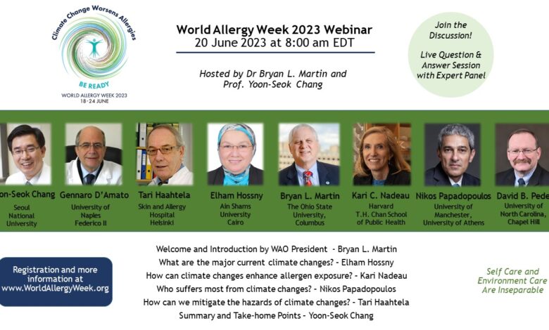 كما يناقش الويبينار عدداً من الموضوعات من بينها كيفية تقديم الرعاية الصحية لمرضى الحساسية في مواجهة الآثار والمخاطر الناجمة عن التغيرات المناخية وكيفية تطبيق نهج جديد للتعامل مع حالات الحساسية مع مراعاة التغيرات المناخية.