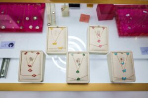 المصممة زاهرة أحمد المرر، أكدت أنها تشارك للمرة الثانية في المعرض، معربة عن فخرها بالمشاركة في هذه المنصة إلى جانب مجموعة من المواهب الإماراتية التي تعمل بروح واحدة لتمثيل دولة الإمارات في مثل هذا الحدث العالمي، مؤكدة أن غرفة الشارقة كانت الداعم الأول والأكبر لها لتكون اليوم مشاركة رئيسية في هذا الحدث وتعرض تصاميمها للعالم أجمع، متوجهة بالشكر والامتنان للغرفة على هذا الدعم الكبير والمتابعة الحثيثة لضمان استمرارية أعمالهم ونجاح مشاريعهم، وقالت المصممة زاهرة: إن معظم تصاميمي مستوحاة من التاريخ وما يدور حولنا من أحداث، فعلى سبيل المثال أحد تصاميمي التي أعرضها حصريا في المعرض تحت عنوان ذا ديكو مستوحاة من حقبة الخمسينات، كذلك قدمت مجموعتي الجديدة بعنوان الحديقة السرية، بالإضافة إلى مجموعة ذا رويال التي تَعدُ زبائننا بالفخافة الدائمة، وجميع تصاميمي مصنعة من الذهب عيار 18 والألماس والأحجار الكريمة.