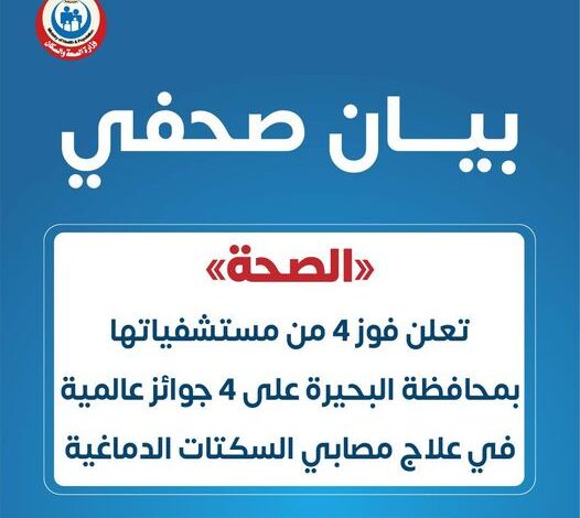 «الصحة» تعلن فوز 4 من مستشفياتها بمحافظة البحيرة على 4 جوائز عالمية في علاج مصابي السكتات الدماغية