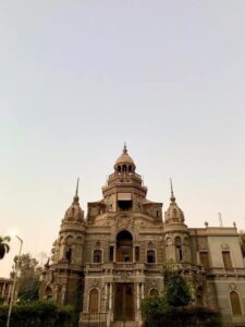 القصر بقبابه مخروطية الشكل وبتصميمه البيزنطي المنتمي للعصور الوسطى يبدو الآن في غير مكانه وسط المباني الحديثة والزحام الشديد والنظرة للقصر من الخارج لن تعطى الانطباع الصحيح ابدا عن مساحته الشاسعة، حيث بني القصر على مساحة 2698 متر مربع يضم أكثر من 50 غرفة ويصل ارتفاعه لخمسة طوابق يحتوى القصر على أكثر من 400 نافذة وباب و 300تمثال ومنهم تمثال نصفي لحبيب باشا السكاكيني بأعلى المدخل الرئيسي للقصر وعلى الرغم من عدم اتساع الحديقة المحيطة بالقصر إلا أنها ساعدت على عزل القصر نوعا من المباني الحديثة من حوله.