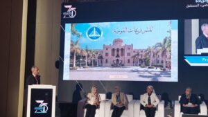 وإستعرض أ.د.عمرو شعت عميد هندسة عين شمس مشاركة الكلية فى المشروعات القومية من خلال مركز الاستشارات الهندسية والأساتذة المتخصصين والاستشاريين بالشركات الاستشارية وساهمت الكلية فى تصميم وإنشاء الجامعات الأهلية بتكلفة 36 مليار جنيه وجامعة عين شمس الأهلية وتطوير الطريق الدائرى الذى يشهد حضور الزائرين لإفتتاح المتحف المصرى الكبير بالاضافة لمشروع تنمية جنوب الوادى وتوشكى واستصلاح 465 فدان بطرق الرى الحديثة والادارة المتكاملة لاستخدام المياه والطاقة الجديدة والمتجددة وتقليل البصمة الكربونية .