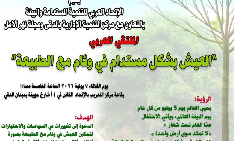 الملتقي العربي” العيش بشكل مستدام في وئام مع الطبيعة” يدعو خلاله إلى تغييرات في السياسات والإختيارات لتمكين العيش في وئام مع الطبيعة بصورة أنظف وأكثر مراعاة للبيئة وأكثر استدامة، حيث لا نملك سوى هذا الكوكب فهو موطننا الوحيد، وعلينا حماية موارده المحدودة.