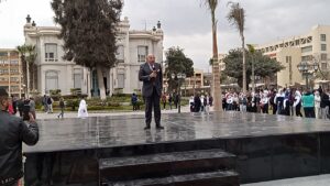 وتعقبها كلمة (نائب رئيس الجامعة لخدمة المجتمع وتنمية البيئة) أ.د هشام تمراز وترحيبه بالسادة النواب وأ.د عبد الفتاح سعود وأ.د أيمن صالح والوكلاء والسفراء والحاضرين جميعًا