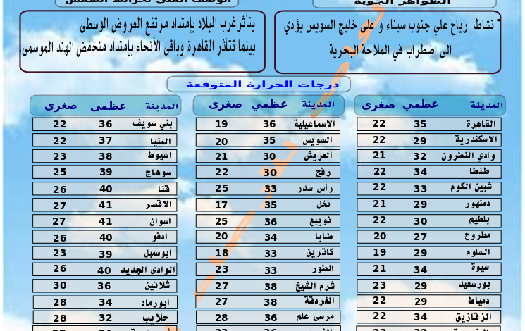 درجات الحرارة فى سيوة الصغرى 21 والعظمى 34 درجات الحرارة فى بورسعيد الصغرى 23 والعظمى 29