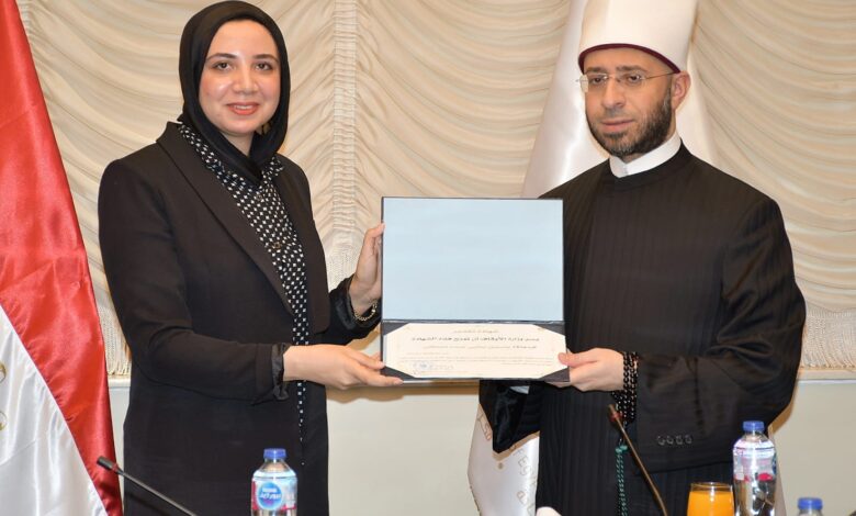 وزير الأوقاف يكرم الباحثة ياسمين مصطفى ويهديها درع الوزارة