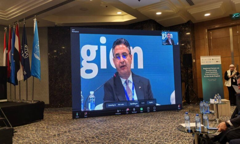 الدكتور شريف فاروق وزير التموين والتجارة الداخلية يُلقي كلمته خلال فعاليات اليوم الأول للمنتدى الإقليمي حول “تسريع النظُم الغذائية في المنطقة العربية” بالعاصمة الأردنية عمان.