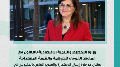 مد فترة إرسال استمارة المقبولين لمبادرة “كن سفيراً” وزارة التخطيط والتنمية الاقتصادية بالتعاون مع المعهد القومي للحوكمة والتنمية المستدامة يعلنان…