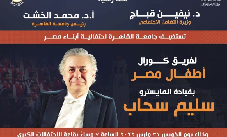 برعاية وزيرة التضامن ورئيس جامعة القاهرة: احتفالية فنية لفريق كورال أطفال مصر بجامعة القاهرة مساء اليوم بقيادة المايسترو سليم سحاب…