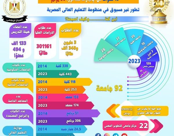 10 سنوات على ثورة 30 يونيو ● ارتفاع عدد الجامعات إلى 92 جامعة ما بين حكومية وأهلية وخاصة وتكنولوجية واتفاقيات…