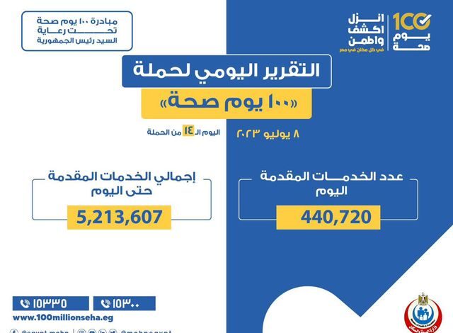 «الصحة» تعلن التقرير اليومي لحملة «100 يوم صحة» -تقديم 440 ألفا و720 خدمة في المبادرات الرئاسية وجميع التخصصات الطبية والعلاجية…