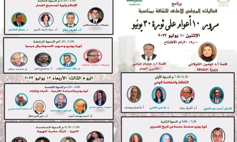 أكمل القراءة »تحت رعاية وبحضور وزيرة الثقافة.. المجلس الأعلى للثقافة يحتفي بمرور 10 سنوات على ثورة 30 يونيو غدًا تحت رعاية وبحضور…