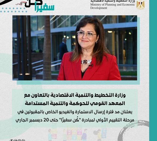 أكمل القراءة »مد فترة إرسال استمارة المقبولين لمبادرة “كن سفيراً” وزارة التخطيط والتنمية الاقتصادية بالتعاون مع المعهد القومي للحوكمة والتنمية المستدامة يعلنان…