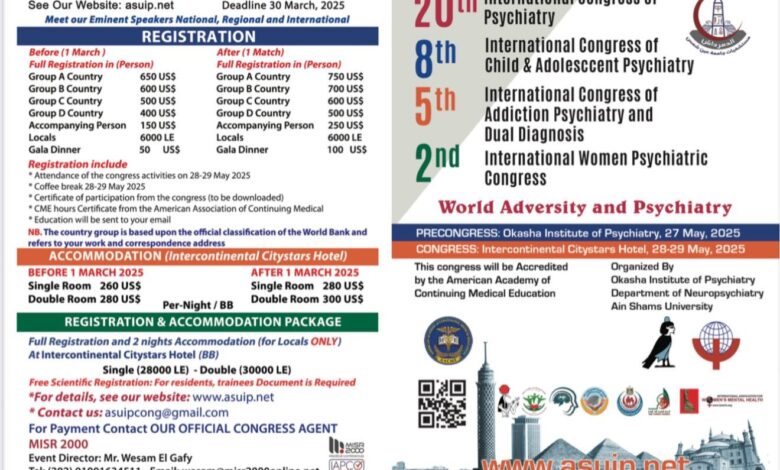 أكمل القراءة »27مايو انطلاق فعاليات المؤتمر الدولى العشرين للطب النفسي والثامن لطب نفس الأطفال والمراهقين والخامس لطب نفس الإدمان والتشخيص المزدوج، والثاني…