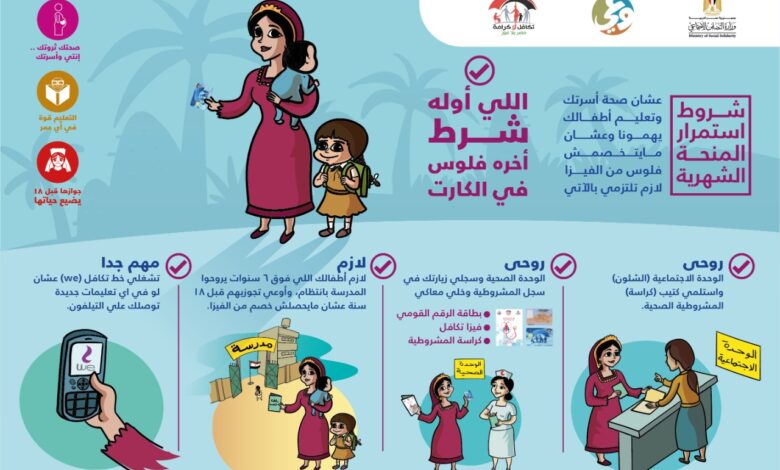 يأتي برنامج الدعم النقدي المشروط “تكافل”، الذى تنفذه وزارة التضامن الاجتماعي منذ 2015، ضمن سياسات الحماية الاجتماعية التى تتبناها الدولة، لمكافحة الفقر متعدد الأبعاد، ، لذا يشترط على هذه الأسر الالتزام بشروط ثلاثة: الأول: التزام الأمهات في سن الإنجاب، والأطفال الأقل من 6 سنوات، بزيارة الوحدات الصحية، لتلقي الخدمات الصحية الوقائية المقررة للطفل والأم، طبقا للمواعيد التى قررتها وزارة الصحة والسكان، والتأكد من تسجيل بيانات الزيارة في سجل المشروطية، بعد كل زيارة.