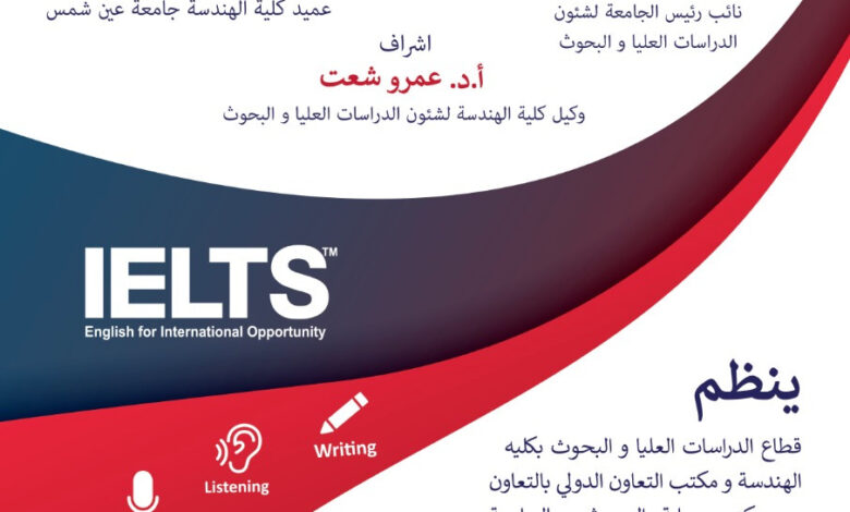 أكمل القراءة »السبت ٢٩ اكتوبر ورشة عمل بعنوان “التأهيل لاختبار الأيلتس” بهندسة عين شمس تحت رعاية الأستاذ الدكتور محمود المتيني رئيس…