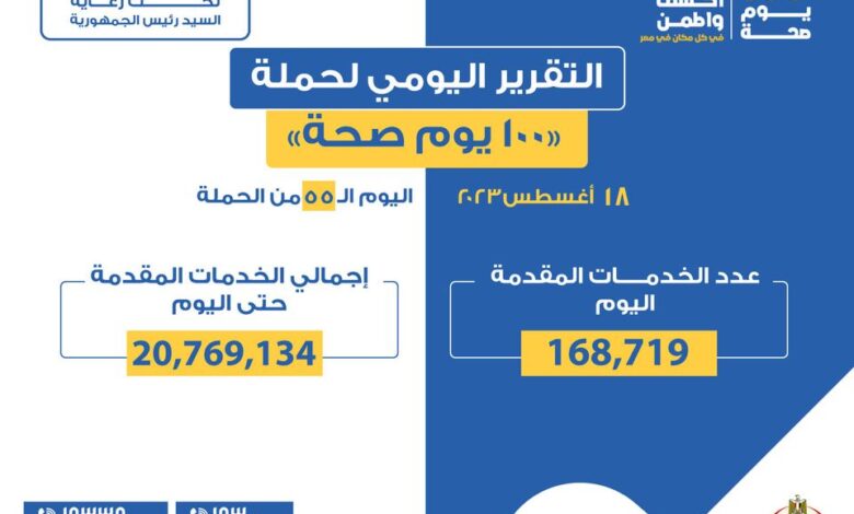 أكمل القراءة »«الصحة» تعلن التقرير اليومي لحملة «100 يوم صحة» – تقديم 168 ألفا و719 خدمة في كافة التخصصات الطبية والعلاجية والوقائية…